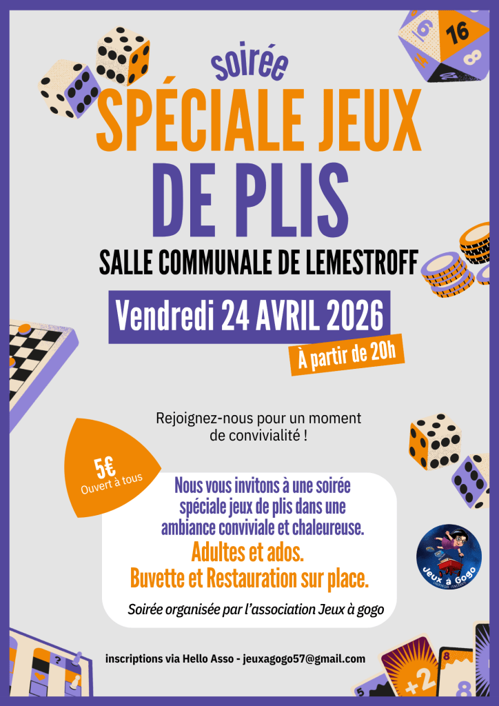 Des ateliers jeux ou activités manuelles seront proposés aux enfants, ainsi que des soirées jeux de société destinés aux ados/adultes. Dans la salle communale de Lemestroff.