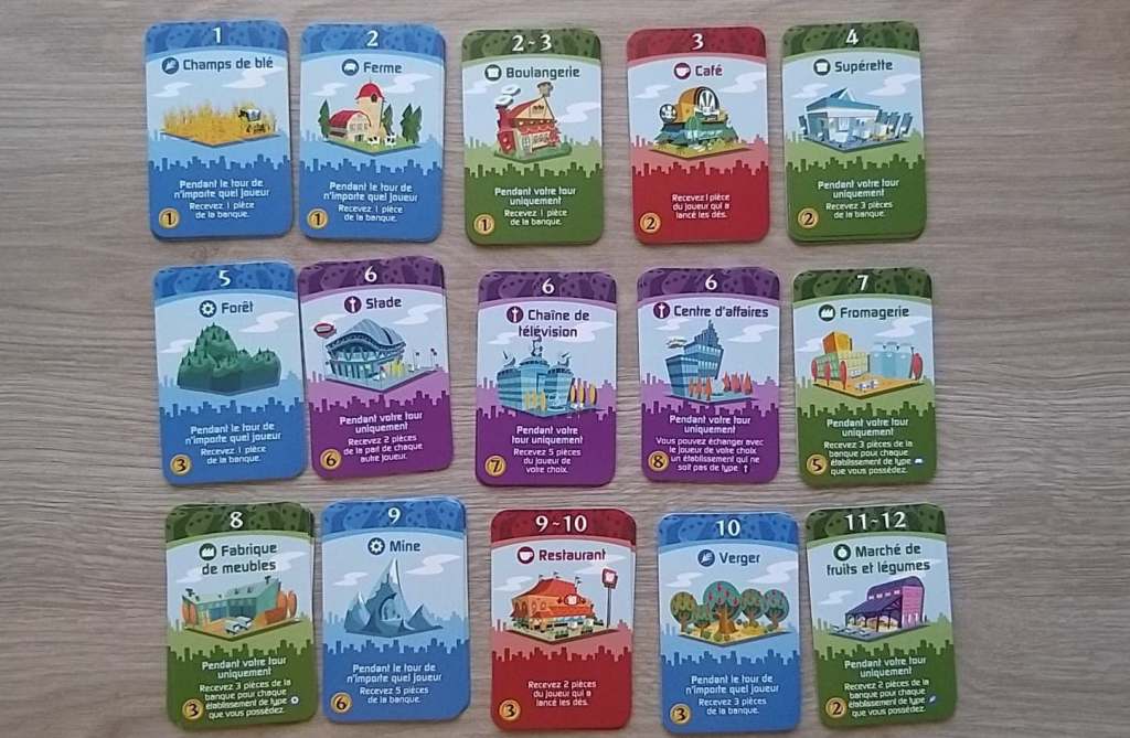 Explications du jeu : Minivilles est un jeu rapide pour 2 à 4 joueurs. Chaque joueur veut développer la ville selon ses propres termes afin d’achever tous les monuments en construction plus rapidement que ses rivaux. A leur tour, chaque joueur lance un ou deux dés. Si la somme des dés lancés correspond au nombre d’un bâtiment qu’un joueur possède, il obtient l’effet de ce bâtiment ; dans certains cas, les adversaires bénéficieront également de votre dé (tout comme vous pouvez bénéficier du leur). Ensuite, avec l’argent disponible, un joueur peut construire un monument ou un nouveau bâtiment, idéalement enrichissant sa ville à l’avenir. Le premier joueur qui construit tous ses monuments gagne !