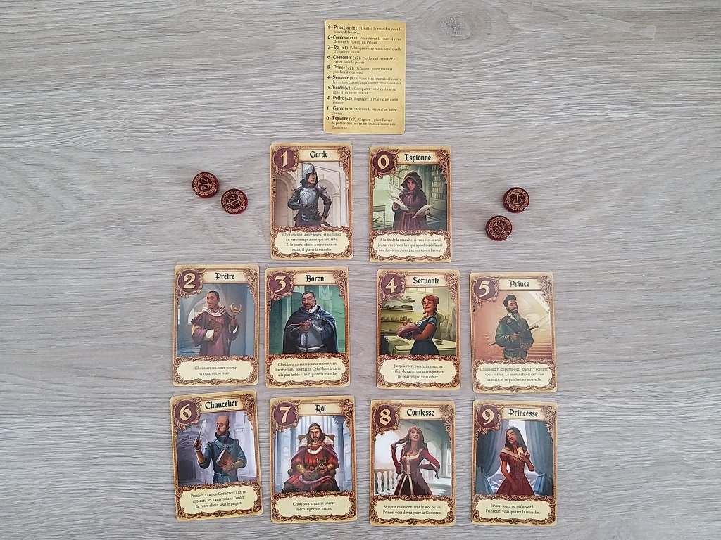 L’avis de l’équipe : C’est un tout petit package, une pochette, une vingtaine de carte et des pions faveurs. Et pourtant c’est un excellent jeu. Il est très simple à comprendre, il y a 10 cartes différentes, représentant 10 personnages numérotés de 0 à 9. Certains sont en plusieurs exemplaires. L’objectif est d’être soit le dernier joueur en vie, soit d’être le joueur avec le personnage ayant la valeur la plus forte en main à la fin de la partie.