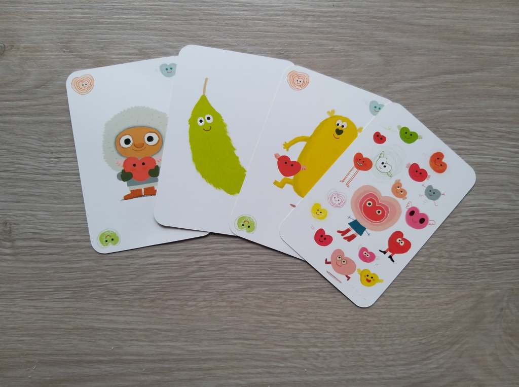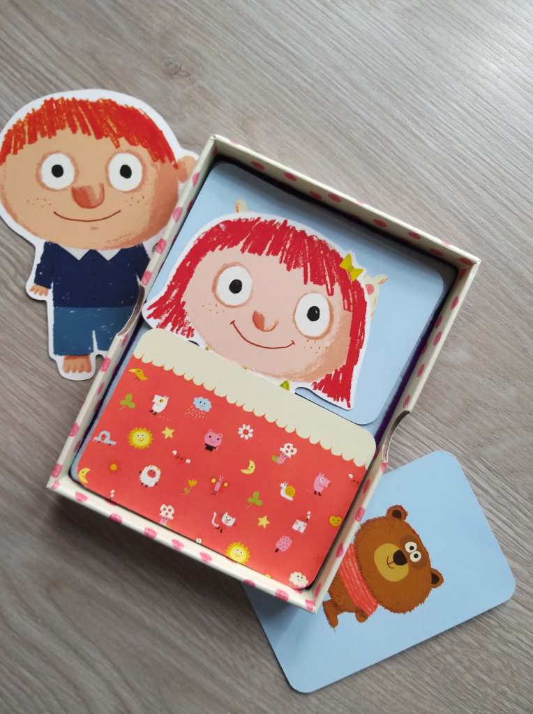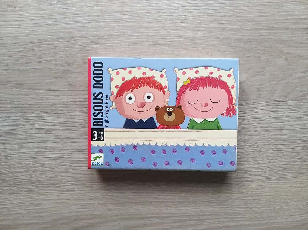 Parfait petit jeu à faire avant d’aller se coucher. Les règles sont très simples , on retourne les cartes jusqu’à trouver le doudou, l’oreiller et la couverture du petit personnage. Mais avant de les trouver on va collecter des cartes ; des attaques de bisous, une chanson, des chatouilles, un bisou esquimau. Toutes ces cartes seront à « distribuer » en fin de partie avant d’aller au dodo.