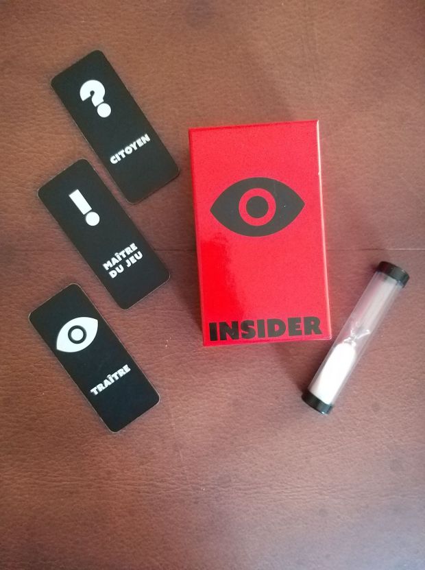 Insider reprend un système de jeu simplissime : des cartes rôles sont distribuées aléatoirement pour 4 à 8 joueurs, désignant un maitre du jeu, un Insider (traitre) et tous les autres joueurs sont d’honnêtes citoyens. Le maitre de jeu doit faire deviner un mot désigné sur une carte secrète. Pendant un sablier d’environ 5 minutes, les joueurs lui posent un maximum de questions auxquelles il répond uniquement par « oui / non / je ne sais pas ». MAIS le traitre connait également le mot secret : à lui de subtilement orienter les questions du groupe, influencer la réflexion générale, voire donner la bonne réponse.