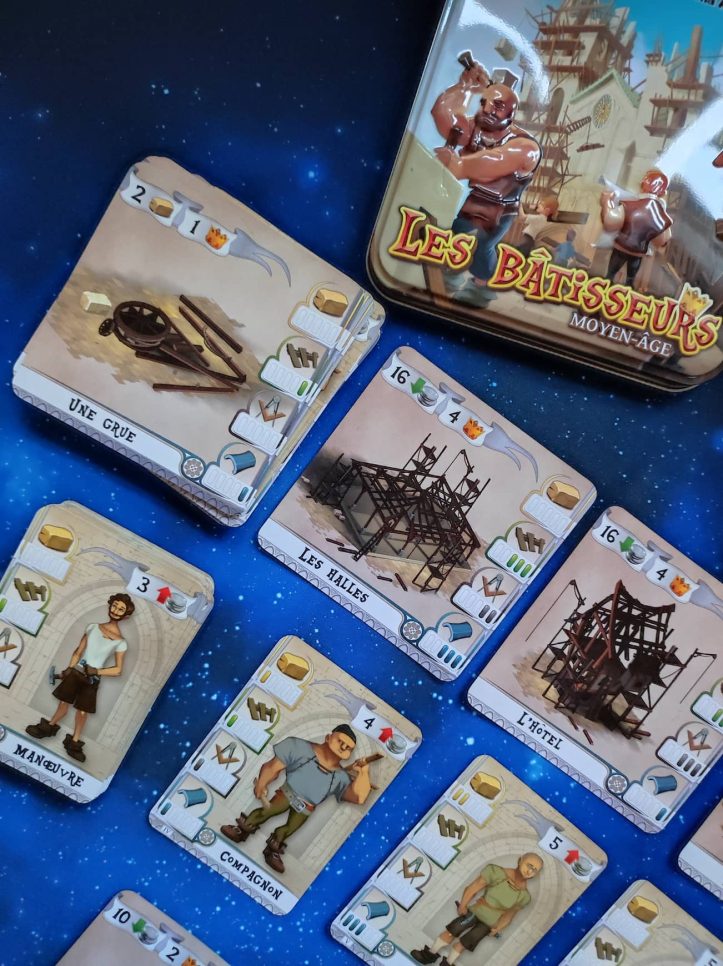 Les bâtisseurs est un jeu de réflexion et de stratégie accessible à tous avec des règles simples et des parties rapides. Pour gagner il va falloir être le premier a atteindre 17 points et pour ça il va falloir faire les bons choix et construire les bons bâtiments. Pas besoin de sortir le livret de règles toutes les 5 minutes, tout est très bien représenté sur les cartes. C’est un petit jeu de gestion facile et familiale où tout y est très fluide. Le seul point faible du jeu c »est qu’il n’y a pas d’interactions entre les joueurs.